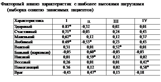 Следовательно, характеристика "больной" относится к Я-реальному. В этот фактор вошли также характеристики "никакой" и "враг". Врагом по отношению к себе выступает сам человек. Нами выявлена тесная обратная связь между переменной "Я-реальное" и "Я-идеальное" в данной выборке. Кроме того, сравнительный анализ между группами пациентов, отобранными нами для исследования, также подтвердил существенное отличие группы аддиктов от групп пациентов с инфарктом и ликвидаторов аварии на ЧАЭС по данным переменным. Данное различие было подтверждено статистически по отношению к группе больных с инфарктом миокарда и к группе ликвидаторов аварии на ЧАЭС.