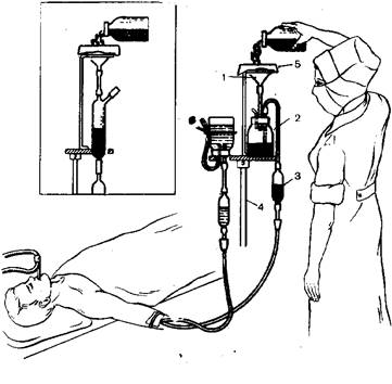 Отсасывание крови из операционной раны осуществляют за счет регулируемого в границах 8,0—20,0 кПа разрежения, создаваемого во флаконе с гемоконсервантом вакуумом-отсосом. Частичная стабилизация, замедление свертывания крови производится в момент ее аспирации из операционной раны за счет гепарина, поступающего к всасывающему отверстию наконечника. Замедлению свертывания собираемой крови способствуют поступающие сюда же реополиглюкин, изотонический раствор хлорида натрия и другие среды. Гепарин дозируется, исходя из расчета 500 ЕД на 1000 мл собираемой крови. Дозировку поступления жидкостей в наконечник отсоса производят в соответствии с объемом отсасываемой с операционного поля крови в соотношении приблизительно 1: 1. Полная стабилизация собранной с операционного поля крови производится цитратным гемоконсервантом во флаконе-накопителе аутокрови. Важным условием эффективной стабилизации собираемой крови явля ется непрерывное и плавное перемешивание ее во флаконе с гемоконсервантом. По мере наполнения флаконов кровью их заменяют новыми.