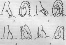 Рис. 1. Схема увеличения путей притока и оттока (по Б. М. Кудишу): 1— увеличение путей оттока левого желудочка; 2 — увеличение путей оттока и притока левого желудочка; 3 — увеличение путей оттока правого желудочка; 4 — увеличение путей оттока и притока правого желудочка.