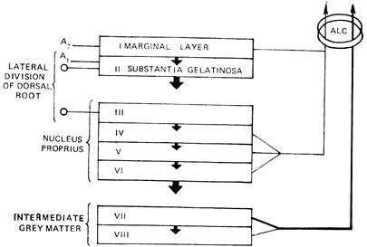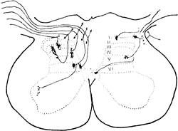 Распределение первичных афферентов в заднем роге спинного мозга. Афферентные волокна различного калибра по-разному распределяются уже в задних корешках перед их входом в спинной мозг — толстые миелинизированные проводники занимают их медиальную часть, а тонкие миелинизированные и С-волокна располагаются более латерально. Перерезка этих латеральных пучков сопровождается уменьшением боли. После входа в спинной мозг А-δ- и С-волокна в составе тракта Лиссауэра идут в каудальном и ростральном направлениях в пределах 1 — 2 сегментов и оканчиваются в дорсальной части заднего рога. Имеется определенное различие в окончании А-δ-, С-волокон, передающих ноцицептивную информацию, и А-δ-волокон, связанных с механорецепторами.