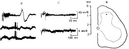 Общепризнанно, что клетки основания заднего рога имеют достаточно широкое, хорошо контурируемое рецептивное поле, окруженное подпороговой зоной, имеющей незначительный афферентный вход на эти нейроны. В тех случаях, когда эффективность афферентного входа возрастает, рецептивное поле может увеличиваться. На этих нейронах конвергируют афферентные волокна различного спектра и модальности, поскольку они отвечают на прикосновение, давление, на механическую и термическую ноцицептивную стимуляцию рецептивного поля. Они моносинаптически активируются низкопороговымн А-волокнами и одновременно имеют полней наптический С-вход. Нейроны IV—V пластин отвечают высокочастотной «пачкой» импульсов на естественное неповреждающее раздражение кожи и длительной импульсной активностью при ноцицептинном воздействии. Частота и продолжительность ответов нейрона возрастает пропорционально интенсивности ноципептивных, особенно термических стимулов.