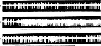 Рис. 3 - Ответ нейрона IV слоя заднего рога спинного мозга на ноцицептивное раздражение кожи, наносимое до и после ритмической стимуляции пизкопороговых афферентов. 1 — фоновая импульсная активность: 2 — импульсная активность при ноцицептивном раздражении до стимуляции низкопороговых афферентов: 3 — то же после ритмического раздражения низкопороговых афферентов