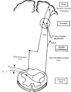 Восходящие пути болевой чувствительности. Существуют 2 основные «классические» — лемнисковые и экстралемнисковые — восходящие афферентные системы. В пределах спинного мозга одна из них располагается в дорсальной и дорсолатеральной зоне белого вещества, другая — в его вентролатеральной части. Известно, что в ЦНС не существует специализированных путей болевой чувствительности и что интеграция боли осуществляется на различных уровнях ЦНС на основе сложного взаимодействия лемнисковых и экстралемнисковых проекций. Вместе с тем не вызывает сомнений тот факт, что значительно большую роль в передаче восходящей ноцицептивной информации играют вентролатеральные проекции, морфофункциональная организация которых детально исследована и обобщена в ряде монографий и обзоров. Об этом свидетельствуют и клинические наблюдения, показывающие, что после антеролатеральной хордотомии или деструкции этой системы при некоторых заболеваниях возникает длительная и выраженная аналгезия. С другой стороны, ощущение боли и ее локализация сохраняются при перерезке всех, кроме вентролатеральных, путей, а стимуляция аксонов в антеролатеральном квадранте после хордотомии вызывает интенсивную боль.