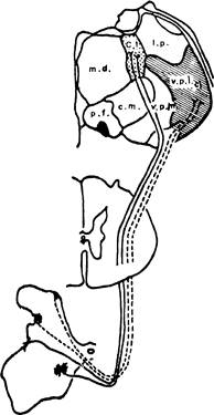 Рис. 7 - Схема спиноталамического тракта. Ядра таламуса, с. 1. — центральное латеральное, с. т. — центральное медиальное; 1. р. — латеральное заднее, m. d. — медиальное заднее, р. f. — парафасцикулярное, v, р. I. каудальная часть вентрального заднелатерадь-ного; v. р. m. — вентральное заднемедиальное
