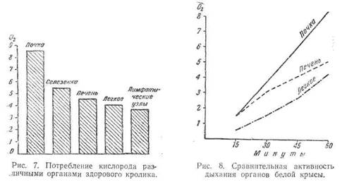 На диаграмме весьма убедительно выделяется наименьшая активность дыхания легочной ткани как по величине, так и по скорости его в почечной ткани максимум поглощения кислорода почти вдвое выше чем легких, уже через 15—20 минут.
