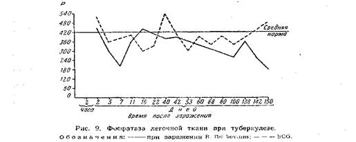 Асфиктическое и ацидотическое состояние в бугорке вызывают гибель фагоцитов и тканевых клеток, прилегающих к центрам формирующихся бугорков. Это подтверждается и рядом гистологических исследований, показывающих наличие дегенеративных изменений в фагоцитах уже на 3-й день (ядро утрачивает структуру, бледно красится и т. д.), С первых же дней заражения и до конца болезни снижается фосфатаза легких, особенно при вирулентном штамме (рис. 9).