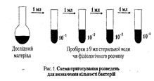 Для приготування розведень беруть ряд пробірок, у кожній з яких міститься 9 мл стерильної води чи фізіологічного розчину. До першої пробірки вносять 1 мл досліджуваного матеріалу, ретельно перемішують новою піпеткою шляхом багаторазового наповнювання піпетки і переносять 1 мл до другої пробірки (розведення 10~2) і т. д. (рис. 1).