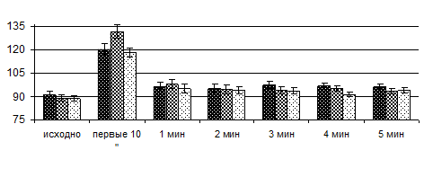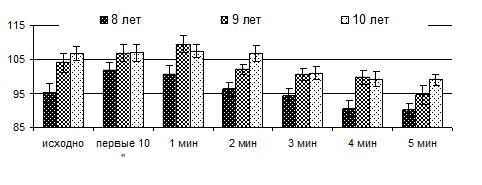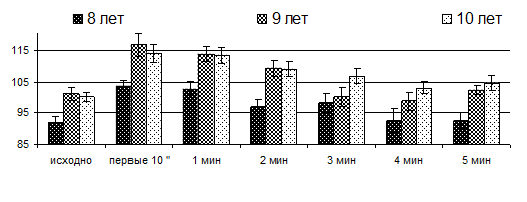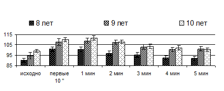 И.п. ЧСС (рис. 3.3.в) у испытуемых достоверно не отличался (8 лет – 90,93±2,19 уд/мин, 9 лет – 88,9±2,07 уд/мин, 10 лет – 88,93±1,73 уд/мин). После выполнения пробы III ЧСС резко возросла у всех возрастных групп, У 9‑тилетних стала достоверно выше. На 1‑й мин восстановления у испытуемых ЧСС снизилась, но достоверно превышала и.п. На 2‑й мин приблизилась к исходному и держалась на этом уровне до конца 5‑й мин восстановления.