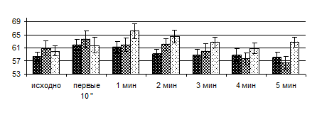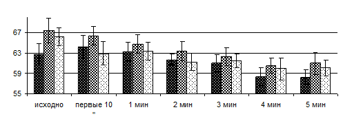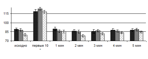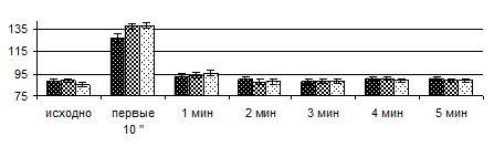 И.п. ДАД (рис. 3.2.б) у испытуемых достоверно не отличается (8 лет – 58,27±1,45 мм рт. ст., 9 лет – 60,96±2,17, 10 лет – 60,06±1,61 мм рт. ст.). После выполнения пробы II и до конца 5‑й мин восстановления ДАД достоверно не изменялось у 8‑ми и 9‑тилетних. У 10‑тилетних ДАД стало достоверно выше и.п. на 7,4% на 1‑й мин восстановления и держалось на этом уровне до конца 2‑й мин восстановления.