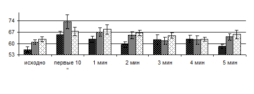 И.п. частоты сердечных сокращений (ЧСС) (рис. 3.2.в) у испытуемых достоверно не отличается: у мальчиков 10‑ти лет 84,63±1,78 уд/мин; у 8‑ми – 87,77±2,34 уд/мин; у 9‑тилетних – 88,46±2,07 уд/мин. После выполнения пробы II ЧСС достоверно повысилась у 8‑милетних на 45,4%, у 9‑тилетних – 55,5%, у 10‑тилетних – 63,1%. У 8‑милетних ЧСС была достоверно ниже других возрастных групп. На 1‑й мин восстановления ЧСС достоверных отличий между возрастными группами не было, но показатели били достоверно выше исходных. На 2‑й мин восстановления показатели всех возрастных групп приблизились к исходным и оставались на этом уровне до конца 5‑й мин восстановления.