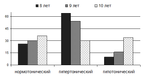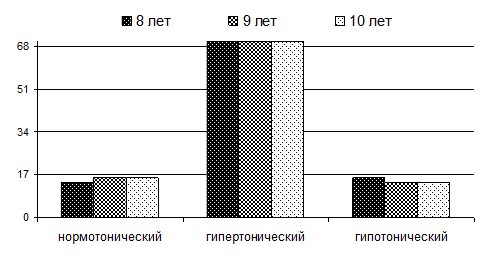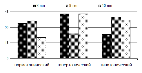 У мальчиков 10‑ти лет процент проявления нормотонического типа реакции самый высокий (36%) (рис. 3.5). Самый низкий – в 8 лет (26%). У мальчиков 9‑ти лет 30%. Гипертонический тип реакции на данную пробу самый высокий у мальчиков 8‑ми лет (64%). Ниже у 9‑тилетних (54%). Самый низкий – у 10‑тилетних мальчиков (30%). Проявление гипотонического типа реакции у 10‑тилетних мальчиков 34%. У 9‑тилетних – 16%, у 8‑милетних мальчиков – 10%.