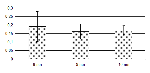 Показатели качества реакции (ПКР) у мальчиков 8 – 10 лет на стандартную мышечную нагрузку достоверно не отличаются (рис. 3.7) и находятся почти на одном уровне. По нормативным данным Кушелевского и Зислина ПКР у испытуемых удовлетворителен. ПКР у мальчиков 8–10 лет указаны в табл. 3.1.