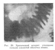 Рентгенологически часто устанавливается повышенная перистальтика тонкой кишки, а при тяжелых формах отмечаются изменения рельефа слизистой оболочки в виде уширения складок, крупнопятнистого рельефа, неравномерной зубчатости по контурам, сглаженности, что гораздо раньше и более четко выявляется в условиях искусственной гипотонии в сочетании с заполнением через зонд отдельных участков кишки бария сульфатом (Ю. В. Линевский) (рис. 29); кроме того, удается выявить мелкие зернистонодулярные образования на рельефе слизистой оболочки (увеличенные одиночные лимфатические фолликулы). Наконец, диагноз могут подтвердить данные аспирационной биопсии тонкой кишки (рис. 30).