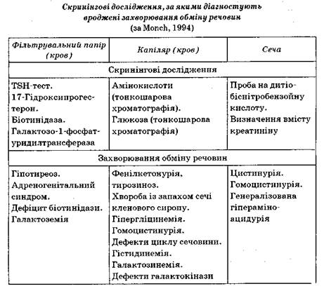 Скринінг вроджених захворювань обміну речовин повинен проводитися всім новонародженим дітям. Для дослідження беруть кров (у капіляр), сечу, а також 6 крапель крові на спеціальний фільтрувальний папір. Матеріал для дослідження беруть на 3-тю — 6-ту добу після народження. Для амінокислотного аналізу і дослідження вмісту цук ру в сучасних умовах рекомендована тонкошарова хроматографія, тест Guthrie (мікробіологічний тест гальмування) менш інформативний. При скринінгових дослідженнях проводять діагностику таких за хворювань.