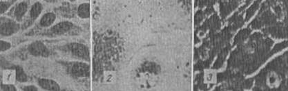 1 – клетки линии MDSK. Окраска гематоксилином х16; 2 – клетки линии МА; эстеразная активность, выявляемая методом диазосочетаний. х40; 3 – культура тригеминального ганглия крысы, 12 дней invitro. Прижизненная микроскопия, фазовый контраст.х40.
