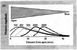 Звуковое восприятие — это не просто вопрос выявления звукового стимула. Информационное содержание звука является функцией его частотного состава. Таким образом, слуховая система зависит от способности ее механосенсорных волосковых клеток быть частотно избирательными. В улитке млекопитающих настройка по частоте зависит от механических свойств специализированной структуры, в которой находятся сенсорные клетки, аналогично механической адаптации, осуществляемой многослойной капсулой в тельце Пачини. Ширина и толщина базилярной мембраны закономерно меняется по длине канала улитки (рис. 1 А). У основания улитки (ближе к овальному окну) базилярная мембрана узкая и жесткая; у противоположного конца (вершина улитки) она широкая и гибкая. По причине этой изменяющейся жесткости входящие звуковые волны вызывают движение жидкости и вибрацию базилярной мембраны в разных участках в зависимости от частоты звука.