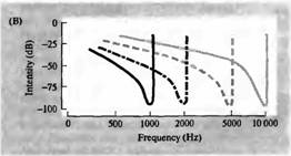 Рис. 2. Настройка улитки. (А) Локализация участков улитки, в которых звуковые волны вызывают максимальное смещение базилярной мембраны, зависит от частоты. Кривые представляют относительное смещение на указанных частотах (100-2000 Гц). (В) Типичные кривые настройки четырех индивидуальных волокон слухового нерва, иннервирующих различные участки улитки. Показана зависимость между частотой звукового стимула и интенсивностью звука в децибелах (dB) необходимой для возникновения разряда в волокне. Пики соответствуют оптимальным звуковым частотам (т. е. частотам, при которых интенсивность стимула для каждого волокна минимальна).