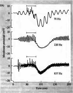 Активация эфферентного пути к уху черепахи вызывает большие гиперполяризирующие тормозные постсинаптические потенциалы (IPSP) в волосковых клетках. Влияние торможения на ответ волосковой клетки на звук показан на рис. 3А. Клетка была стимулирована чистыми тонами на трех частотах, одна из которых является оптимальной для данной болосковой клетки, вторая — более высокой частотой, и третья — более низкой частотой. Интенсивности тонов были отрегулированы так, что все они вызывали осциллирующий рецепторный потенциал одной и той же амплитуды. Короткая серия стимулов, поданная на эфферентное волокно, гиперполяризировала клетку и сильно ослабила ее ответ на тон при 220 Гц (характеристическая частота).