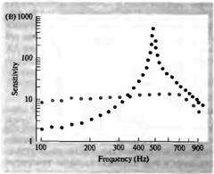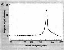 ответ с частотой около 350 Гц. Это та же частота, что и у чистых тонов, к которым волосковые клетки наиболее чувствительны, как показано на рис. 6С. Здесь тон постоянной интенсивности подавался на внешнее ухо, и его частота постепенно менялась от 20 до 1 000 Гц. Электрический ответ волосковой клетки достигал пикового значения при 350 Гц. Осцилляция потенциала, вызванная коротким звуковым сигналом, и кривая настройки, полученная путем подбора частоты, являются эквивалентными средствами для измерения частотной избирательности волосковой клетки.