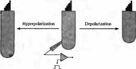 Рис. 4. Электрическая подвижность наружных вол сковых клеток. Для фиксации мембранного потенциала наружных волосковых клеток, изолированных из улитки позвоночных, были использованы пэтч пипетки Деполяризация приводила к укорочению клеток; гилерполяризация делала их длиннее. Такие изменения длины могли быть достаточно веяики, достигая 30 нм/мВ.