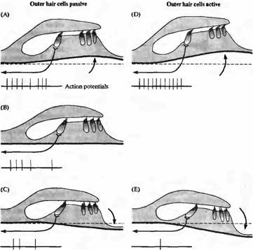 | Рис. 5. Движение структур улитки. Во время волновых колебаний жидкости, вызванных звуком, подвижные структуры улитки (базилярная мембрана и орган Корти) перемещаются вверх и вниз. (А) Во время фазы разрежения звуковой волны базилярная и покровная мембраны смещаются вверх, приводя к отклонению волосковых пучков в направлении наиболее длинного стереоцилия — деполяризация волосковых клеток по сравнению с состоянием покоя (В). (С) Перемещение вниз во время фазы сжатия звуковой волны вызывает противоположное отклонение волосковых пучков и волосковые клетки гиперполяриэуются относительно спокойного состояния. (D) Активное сокращение наружных волосковых клеток во время деполяризации усиливает направленное вверх смещение базилярной мембраны. (Е) Гиперполяризация наружных волосковых клеток приводит к их удлинению. Результирующий эффект состоит в увеличении смещения базилярной мембраны за счет «мышечного» действия наружных |