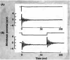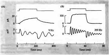 больший по величине, быстро нарастающий выходящий ток, свидетельствующий о более высокой плотности калиевых каналов с более быстрой кинетикой. Частота настройки осцилляторного ответа также пропорционально возрастает до 200 Гц.