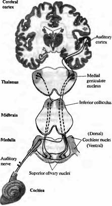 Основные слуховые пути схематично представлены на рис. 8. Слуховые волокна восьмой пары черепномозговых нервов направляются центрально и посылают ветви как в дорзальные, так и в вентральные кохлеарные ядра. Аксоны второго порядка восходят в составе контралатерального бокового леминиска, иннервируя клетки в нижних бугорках четверохолмия (ядро бокового лемниска является станцией синаптического переключения для некоторых из этих волокон). Нейроны в вентральном кохлеарном ядре также дают коллатеральные ветви как к ипсилатеральным, так и к контралатеральным ядрам верхних олив. Клетки третьего порядка, расположенные в ядрах верхних олив, в свою очередь, посылают восходящие волокна в нижние бугры четверохолмия. Путь продолжается через ядра медиального коленчатого тела таламуса к слуховой области поперечной височной извилины верхней части височных долей коры головного мозга. Каждый уровень в слуховом пути тонотопически картируется.
