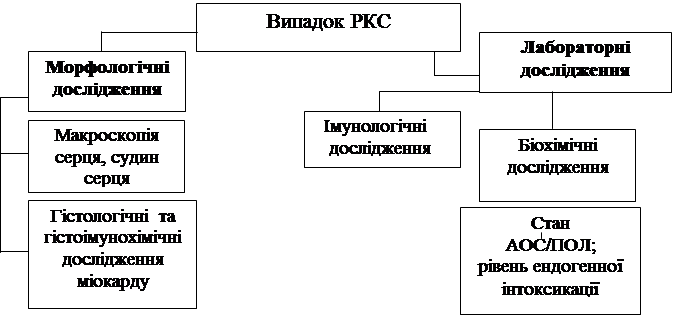 Мета і завдання дослідження. Метою дослідження є підвищення ефективності діагностики РКС, що обумовлена ССЗ, на підставі розробки достовірних критеріїв судово-медичної діагностики РКС з урахуванням морфологічних, імунологічних, біохімічних показників. Виходячи з поставленої мети, визначено такі основні завдання дослідження: