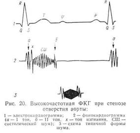 На ФКГ, записанной с верхушки сердца, в 50 % случаев регистрируется «систолический толчок» (или тон изгнания) — несколько коротких колебаний после I тона. Этот признак чаще встречается при врожденном аортальном стенозе. Во II межреберье справа и на рукоятке грудины через небольшой интервал после I тона хорошо выражен систолический шум ромбовидной или овальной формы (колебания вначале нарастают, а затем уменьшаются). Такая форма шума сохраняется при записи с отдаленных точек (над верхушкой, в точке Боткина), что важно для дифференциальной диагностики шума при аортальном стенозе и при митральной недостаточности. Амплитуда II тона над аортой снижена (рис. 20).