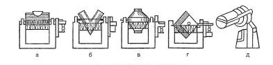 Рис. 6. Змішувачі з обертовим корпусом: а – кульовий млин; б – V-образний змішувач; в – двохконусний змішувач; г – кубічний змішувач; д – турбула