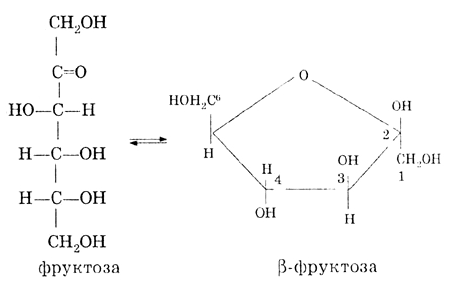 Изомером глюкозы является фруктоза. Фруктоза - это кетоноспирт. В растворе она также находится в равновесии с циклической (полуацетальной) формой:
