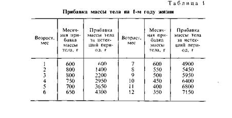 Первоначальная масса тела новорожденного удваивается к 4 мес жизни и утраивается к 10— 11 мес. Должную массу тела ребенка любого месяца жизни до 1 года можно вычислить также следующим образом: к массе тела ребенка при рождении прибавляют за 1-й месяц 600 г, за 2-й и 3-й месяцы — по 800 г, масса тела каждого последующего месяца на 50 г меньше таковой по сравнению с предыдущим месяцем.