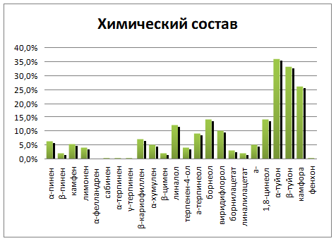 Химический состав: Линалилацетат (до 75%), пинены, линалол, микрин, фелландрен, гермакрен D. Состав зависит от места произрастания.