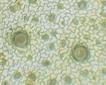 Микроскопические признаки лекарственного растительного сырья: эфиромасличные вместилища, устьица, извилистостенные клетки, простые многоклеточные волоски, головчатые волоски.
