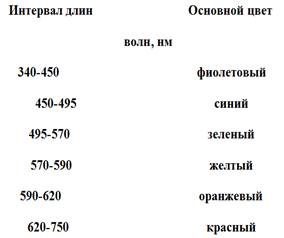 Совокупность всех частот (длин волн) электромагнитного излучения называют электромагнитным спектром. Интервал длин волн разбивают на области: ультрафиолетовая (УФ) примерно 10-380 нм, видимая 380-750 нм, инфракрасная (ИК) 750-100000 нм.