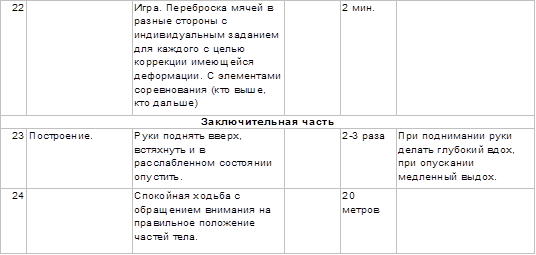 В начале основной части урока занятия проводятся в вертикальном положении. Упражнения подбираются с учетом деформации. Затем используются специальные упражнения в положении лежа. В середине основной части включаются упражнения на снарядах (наклонная плоскость, гимнастическая стенка и скамейка) с применением ФУ на специальную коррекцию, деторсию и равновесие. В конце основной части урока с целью переключения детей на положительные эмоции вводятся игры, повышающи настроение больных, активнось и бодрость, усиливающие активность ДС и ССС.