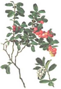 Вечнозелёный кустарничек с мелкими листьями, поникшими розовыми цветками и шаровидными очень кислыми ягодами сначала белого, а при созревании тёмно-красного цвета.