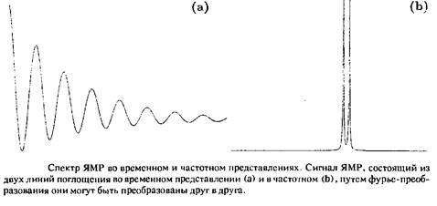 В, перед обработкой должен быть усилен, прежде чем будет проведена его регистрация с помощью фазочувствительного детектора. В cw-спектроскопии сигнал непосредственно подается на самописец, а в фурье-спектроскопии - на аналого-цифровой преобразователь в ЭВМ. Этот изменяющийся во времени сигнал подвергается фурье-преобразованию и вновь подается на устройство вывода информации - самописец или экран графического дисплея.