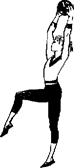 2. Высокий шаг. И. п. - стать в первую позицию, руки за голову. I. Шаг правой ногой вперед, левую согнутую поднять вперед повыше, потянуться вверх. 2. Выпрямляя левую ногу, шаг вперед.