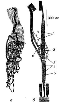 Рис. 4. Рецептори м'язів: а — вільні закінчення аферентного волокна, які обплітають кінець м'язового волокна; б — м'язове веретено; 1,4— закінчення еферентного волокна; 2 — закінчення аферентного волокна; 3 — капсула; 5 — внутрішні м'язові волокна; 6, 8 — еферентне волокно; 7 — аферентне волокно рецептор.