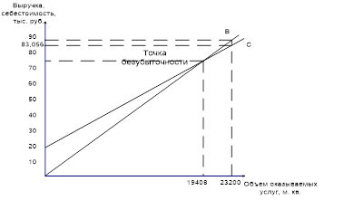 Вывод: Таким образом, за период на конец 2006 года организации необходимо было производить услуги объемом не менее 19408 м2 для достижения безубыточной работы, при этом выручка с предоставленных услуг составляла 75 тыс. руб.