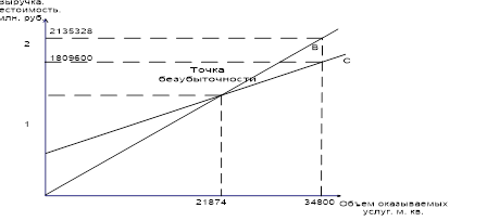 За период 9 мес. 2006 года организации необходимо было производить услуги объемом не менее 21874 м2 для достижения безубыточной работы, при этом выручка с предоставленных услуг составляла 1,354 млн. руб.