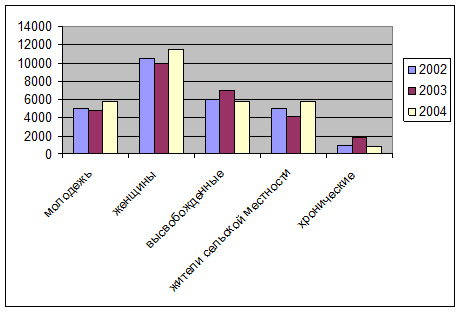 Наиболее высокой была общая численность безработных, состоявших на учете в течение 2004 года, кроме г. Перми (14005 чел.), в Березниках (3050 чел.) и Соликамске (2397 чел.), а по сельским районам - в Осинском (2081 чел.), Пермском (2060 чел.), Чернушинском (1950 чел.).