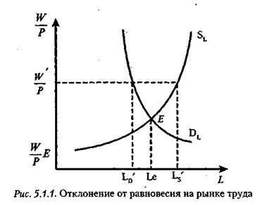 '. В этой ситуации происходит отклонение от положения полной занятости, рабочих мест не хватает для всех желающих продать свой труд при заработной плате W'/Р. Возникает избыток предложения труда, измеряемый отрезком (LD