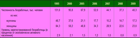 За 2009 г. в органы по труду, занятости и социальной защите за содействием в трудоустройстве обратилось 261,6 тыс. человек (103,1 процента к соответствующему периоду 2008 года), из них зарегистрированы безработными 161,8 тыс. человек (104,1 %).