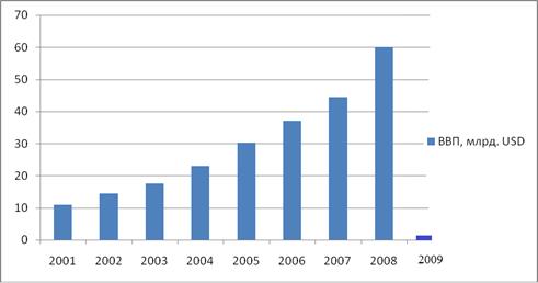 На протяжении 2001-2008 года в Республике Беларусь наблюдался стабильный рост ВВП (рис. 2.1). По 2008 года объем номинального ВВП Республики достиг 59.9 млрд. долларов и увеличился в 4.8 раза по сравнению 2001 годом. В 2008 рост реального ВВП составил 10%. В 2005-2008 гг. среднегодовой темп реального прироста ВВП Беларуси составлял 9.4%. Данные показатели росли существенно выше среднемировых, а также показателей соседних стран, например, в 2008 году рост экономики России составил 6%, Украины - 2.1%, Казахстана – 3.1%, Польши - около 5.4%.