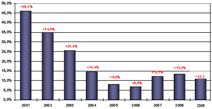 Тем не менее, в связи с замедлением роста доходов населения и объемов потребительского кредитования, уже с 4-го квартала 2008 года наблюдалось падение спроса, следовательно, замедление роста товарооборота.