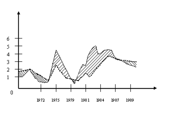 Как видно из рис. 1, после 1982г. в американской экономике происходит постоянное увеличение структурного дефицита, что вызвано прежде всего увеличением расходов на оборону и объема трансфертных платежей.