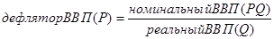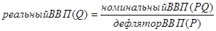 Дефлятор ВВП измеряет интенсивность инфляции или обратного процесса – дефляции, когда наблюдается снижение общего уровня цен в стране. Если величина индекса цен оказалась больше 1, то мы произвели дефлирование ВВП, т.е. элиминировали фактор инфляции. Если же индекс цен оказался меньше 1, то мы произвели инфлирование, т.е. очистили номинальный ВВП от влияния дефляции.