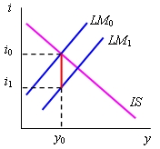 Посредством мультипликатора можно также представить в алгебраической форме последствия увеличения номинального количества денег в кейнсианской модели. Если в состоянии ОЭР возрастет предложение денег, то домашние хозяйства используют их на покупку облигаций, так как при заданной величине дохода спрос на деньги для сделок фиксирован. Увеличение спроса на облигации повысит их курс и снизит текущую ставку процента. Величину ее снижения определим, записав в приращениях условия на денежном рынке при фиксированных значениях уровня цен и национального дохода
